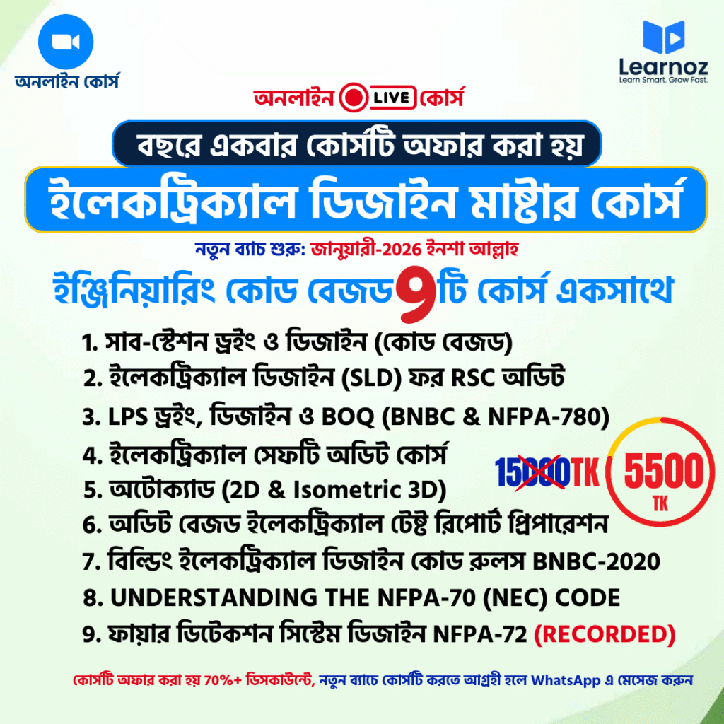 ইঞ্জিনিয়ারিং কোড ও RSC, Nirapon, Elevate অডিটের রিকোয়্যারমেন্ট অনুযায়ী প্রফেশনাল ইলেকট্রিক্যাল ডিজাইন শিখার পূর্ণাঙ্গ প্ল্যাটফরম। ইন্ডাস্ট্রিয়াল জবের প্রতিদিনের সমস্যার বাস্তবসম্মত সমাধানভিত্তিক ক্যারিয়ার গ্রোথ লার্নিং